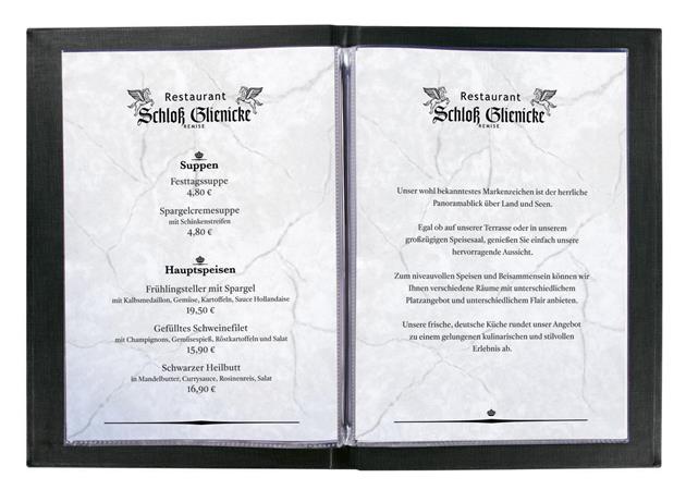 Minőségi étlaptartó, mely soha nem megy ki a divatból.-A4 formátum-méret: 210 x 297 mm-könnyen behelyezhető és cserélhető dokumentumok-kapacitás: 8 oldal-gumiszalagos kötés-könnyen tisztítható-tartós PU anyag-kopás és karcálló anyag-2 áttetsző betétet tartalmaz, mely 8 oldalhoz elegendő (további betétlapok SISM180 cikkszámon elérhetőek)Gyártó/első EU forgalmazó elérhetősége: SIGEL GmbHBaeumenheimer Strasse 10, 86690 Mertingen, Germanysandra.geist@sigel.dewww.sigel-office.com