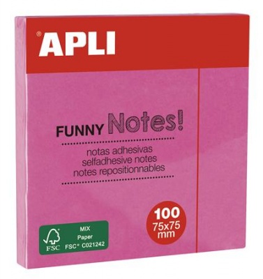 Öntapadó jegyzettömb, 75x75 mm, 100 lap, APLI "Funny", neon rózsaszín