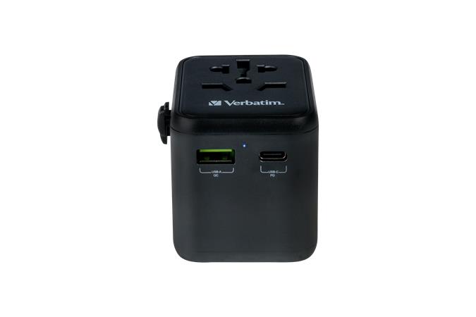 A Verbatim univerzális utazási adapter több mint 180 országban használható: a világ bármely helyi tápegységéhez csatlakozhat, és újratöltheti energiaigényes eszközeit, például laptopjait és fényképezőgép-akkumulátorait. Az alján található USB-C és USB-A portok segítségével feltöltheti bármilyen USB-eszközét.